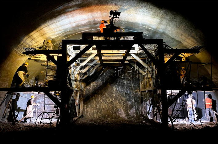 為破解特殊地質(zhì)施工難題,建設者聯(lián)合設計院、監理、高校和專(zhuān)家,對專(zhuān)項施工方案逐一論證,超前制定風(fēng)險應對措施。施工中,他們踐行“項目成敗,責任在我”“管生產(chǎn)必須保安全”等理念,堅持“以工裝保工藝,以工藝保工序,以工序保質(zhì)量”原則,推行科技創(chuàng )新,執行“管超前、短進(jìn)尺、弱爆破、強支護、快循環(huán)、勤量測”的施工方式,創(chuàng )新運用“臺階預留核心土開(kāi)挖法”“徑向注漿”“全斷面帷幕注漿”“自進(jìn)式管棚”等先進(jìn)工藝,確保施工安全,實(shí)現工程質(zhì)量一次成優(yōu)。